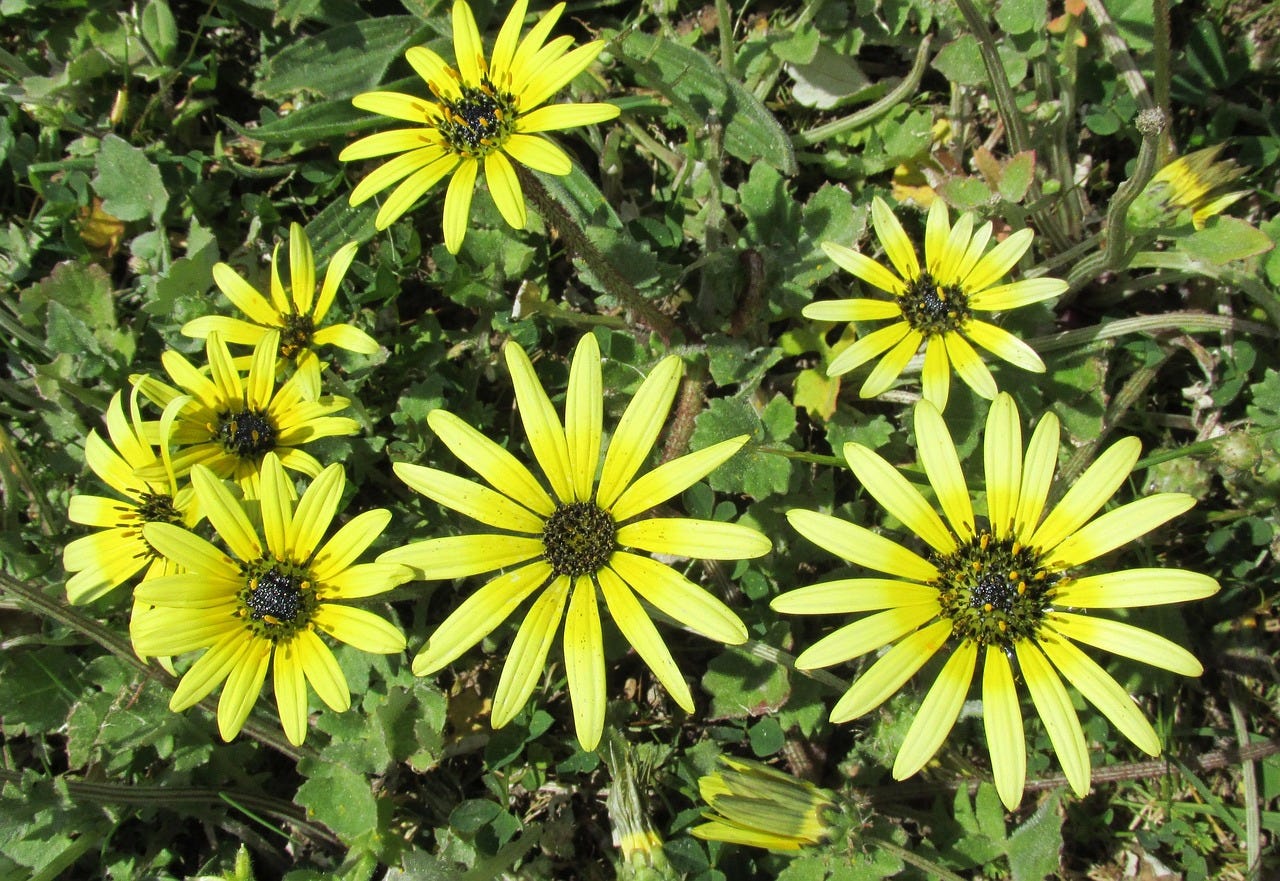 School day crushes will throw their hands up at the very notion of eradicating the common Cape Weed, the glorious mini sunflower-like plant, the one that said, petal by petal, he loves me, he loves me not, until the last petal pulled declared the truth of your heart’s desire.